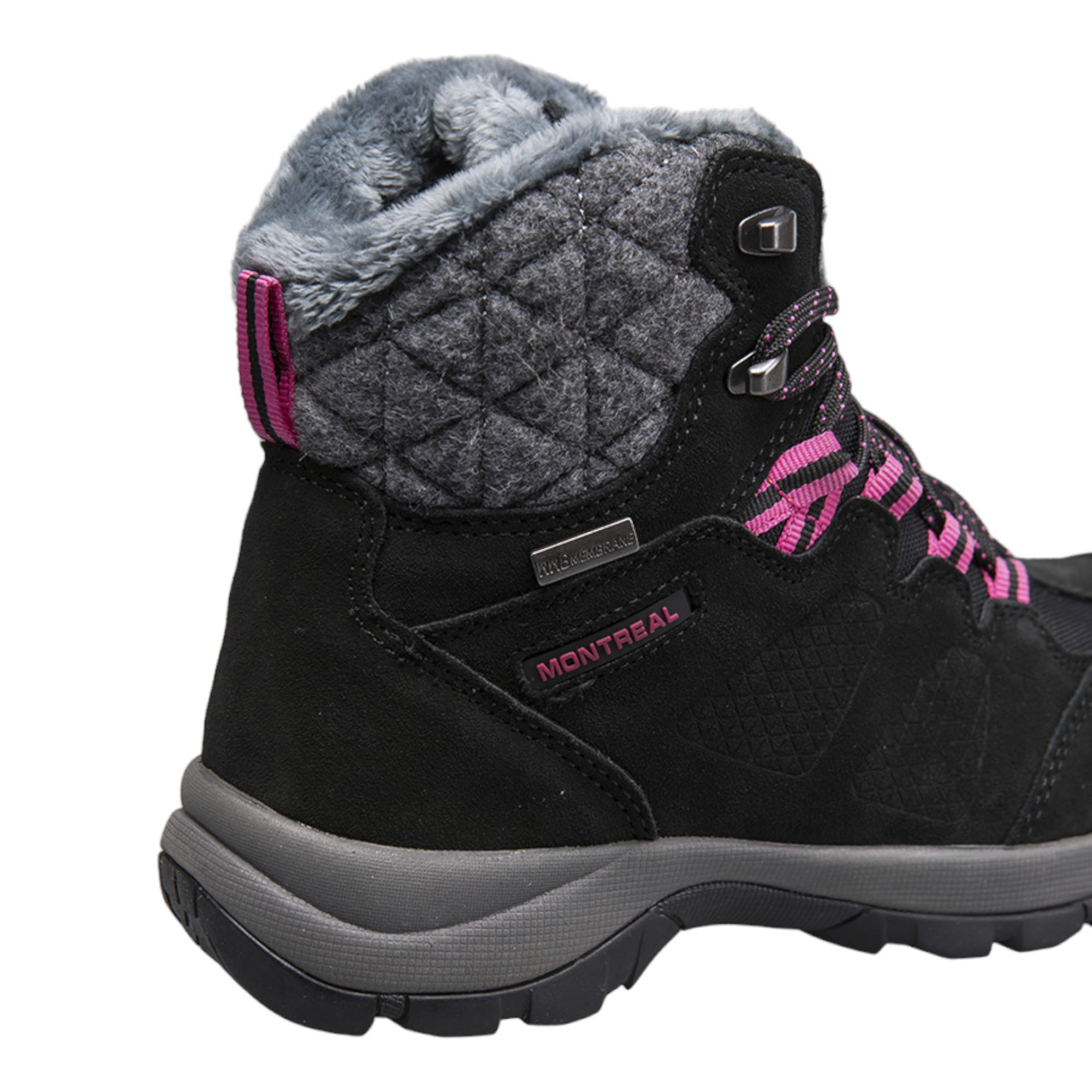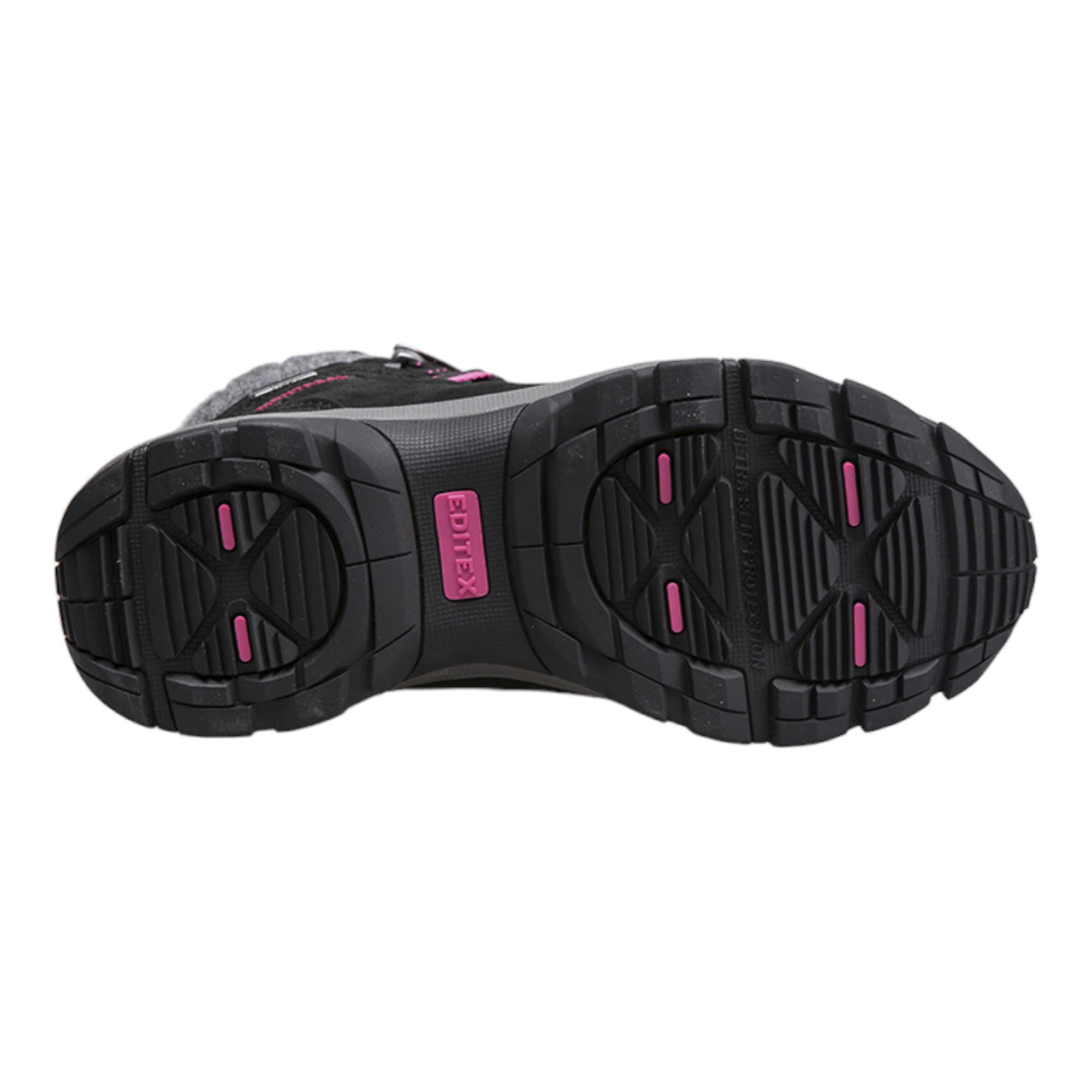 Сочетая стильный контрастный дизайн вместе с качественной сборкой и материалами ботинки Editex Montreal станут отличным выбором для любителей активного отдыха или просто для обычных пеших прогулок по городу. Внешний слой ботинок выполнен на основе износостойкой замши, что в сочетании с водоотталкивающей обработкой Durable Water Repellent (DWR) позволяет ботинкам выдерживать попадание влаги и мокрого снега при ходьбе. Для дополнительной защиты от попадания влаги изделие оборудовано мембранной, произведённой по технологии Waterproof Windproof Breathable (WWB), благодаря микроскопическим порам обеспечивается вентиляция внутреннего пространства ботинок, защищая ноги от попадания влаги извне с сохранение комфортного микроклимата. Современный утеплитель Thinsulate за счёт полиэфирных микроволокон эффективно удерживает тепло, термоизолируя ноги владельца и позволяет с комфортом носить обувь в широком температурном интервале. Валяная шерсть на голенище ботинок придаёт не только особый вид изделию, но также защищает голень от холода и ветра. Специальная колодка позволила создать максимально удобную обувь для женской ноги, что в сочетании с антимикробными съёмными стельками OrthoLite, защищающие от неприятного запаха и обеспечивающие дополнительную вентиляцию стопы, позволяет ощущать комфорт даже при суровых погодных условиях. Промежуточная подошва EVA эффективно распределяет нагрузку при ходьбе, делая пешую прогулку мягкой и комфортной. Подошва Ultra Slip Protection (USP) обладает высокой гибкостью и износостойкостью благодаря прочной резине с развитым рисунком протектора, что обеспечивает надёжное сцепление с рельефом. Прочная шнуровка с крепкими петлями создаёт надёжную посадку на ноге. Крепкие материалы с прошивкой из двойной строчки позволяют ботинкам выдерживать длительное ношение и множественную чистку с сохранением свойств и цвета. Контрастный дизайн чёрного цветового исполнения с яркими розовыми петлями позволяет обуви сочетаться как со спортивной, так и с повседневной одеждой.Характеристики: